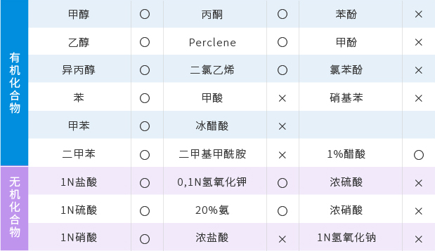 (記号〇:穩定/記号×:溶解或膨脹,不宜使用(yòng))